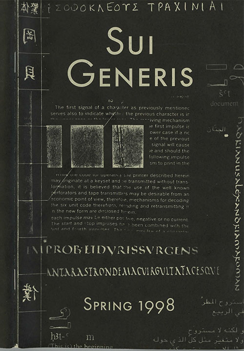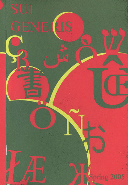 Sui Generis first saw the light in 1997 as an initiative of the Foreign Languages, Cultures, and Literatures faculty at Bard. It has been published once every spring since that year, and has grown to accommodate the new languages that entered our curriculum, such as Arabic and Japanese. We chose the name Sui Generis—“of its own kind”—because we saw this as a unique sort of publication. Our primary goal was—and still is—to encourage students to produce original creative work in a foreign language, or to translate the work of other authors. This little magazine also offers language students new opportunities to work closely with our faculty and Foreign Language Exchange Tutors. Over the years Sui Generis has given increased visibility to Bard’s innovative language programs, and we are proud of all the dedication our student contributors and editors have shown.